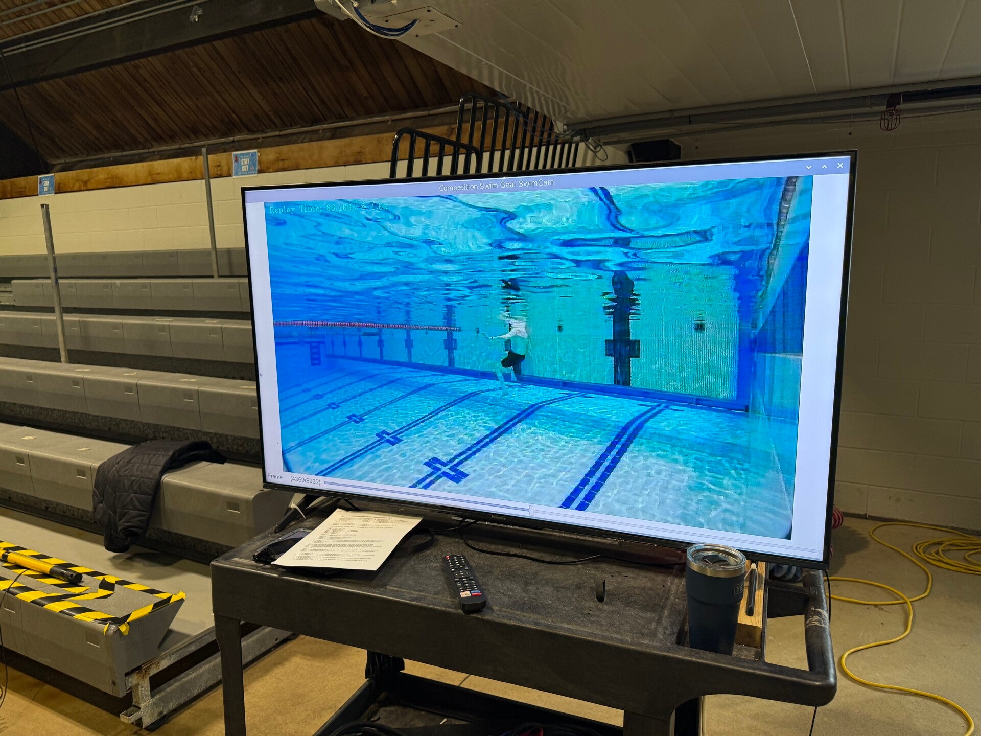 With a SwimCam video delay system, swimmers at any level can see the last 8 - 12 seconds of their just-completed swim played back on a large flat screen. This allows them to see what they are doing, rather than just guessing, leading to faster and more effective technique adjustments.